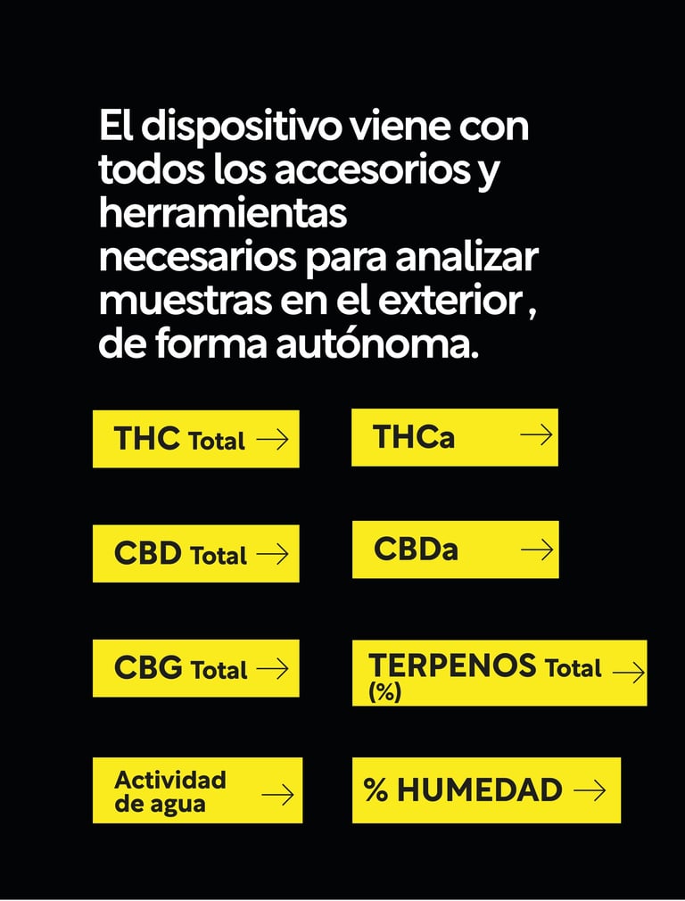 Un dispositivo de mano para analizar THC total, CBD, CBG, THCa, CBDa y terpenos totales en muestras de cannabis seco y molido. El equipo incluye todos los accesorios y herramientas necesarios para analizar muestras en exteriores.