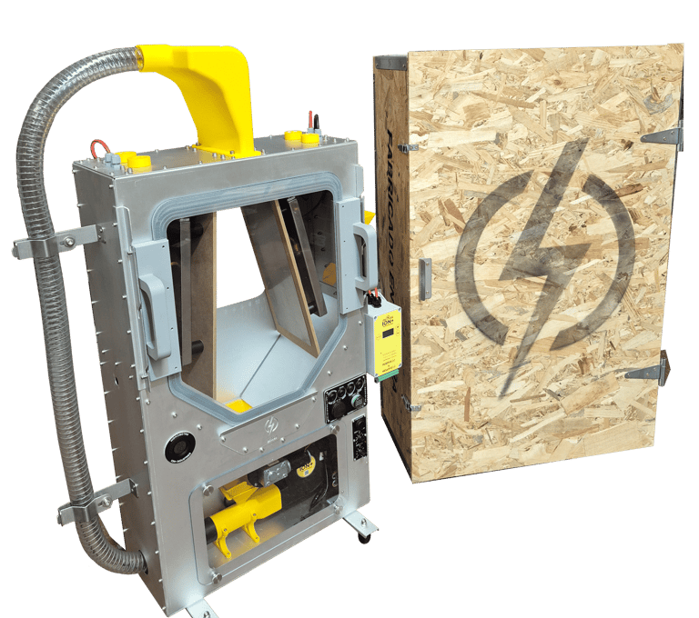 La máquina cumple con la normativa CE e incluye medidas de seguridad como la apertura de puertas solo cuando las placas están apagadas para evitar chispazos. La máquina tiene pocos voltios, lo que minimiza cualquier riesgo en el caso de contacto o fallo del sistema de seguridad.
